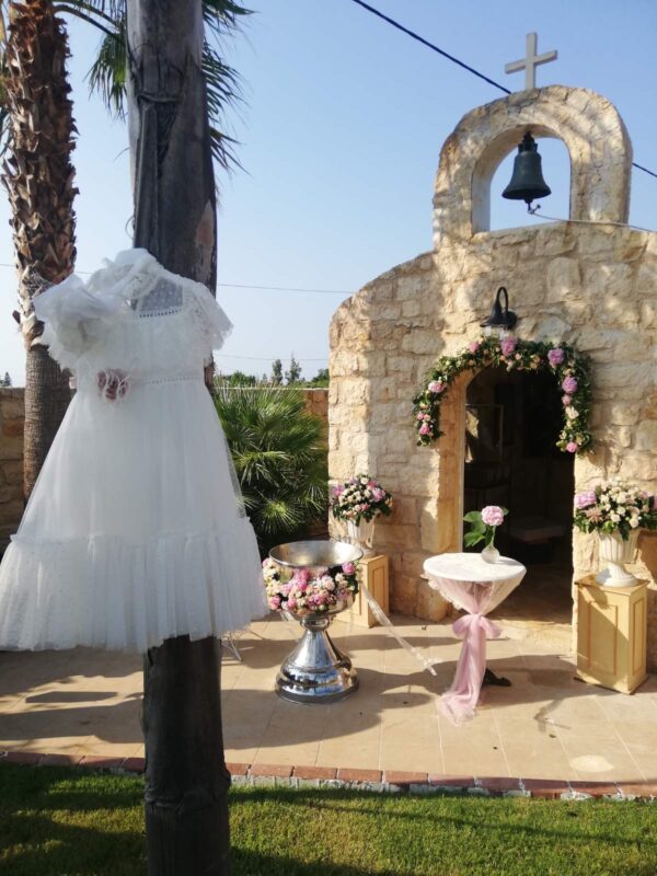 Ένα γλυκό ανοιξιάτικο μεσημέρι, μετά τη λήξη της πρώτης καραντίνας μας επισκέφτηκε στο μαγαζί η Μαρία Αστροπαλήτη. Είχε στην αγκαλιά της ένα μελαχρινό πανέμορφο κοριτσάκι. Ήθελε να οργανώσει τη βάφτιση του στο σπίτι τους στο Ακρωτήρι και μας ζήτησε την απόλυτη επιμέλεια του μυστηρίου.