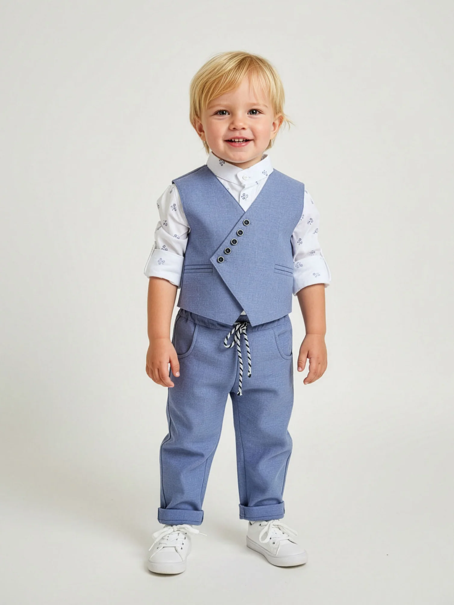 “Designer’s Cat” μοντέρνο σύνολο για αγόρι που αποτελείται από σταυρωτό γιλέκο και παντελόνι από εξαιρετικό βαμβακερό ύφασμα, τυπωμένο πουκάμισο σε απαλή βαμβακερή ποπλίνα σε στυλ Μάο και ασορτί καπέλο. Μια τέλεια επιλογή για ειδικές εκδηλώσεις.