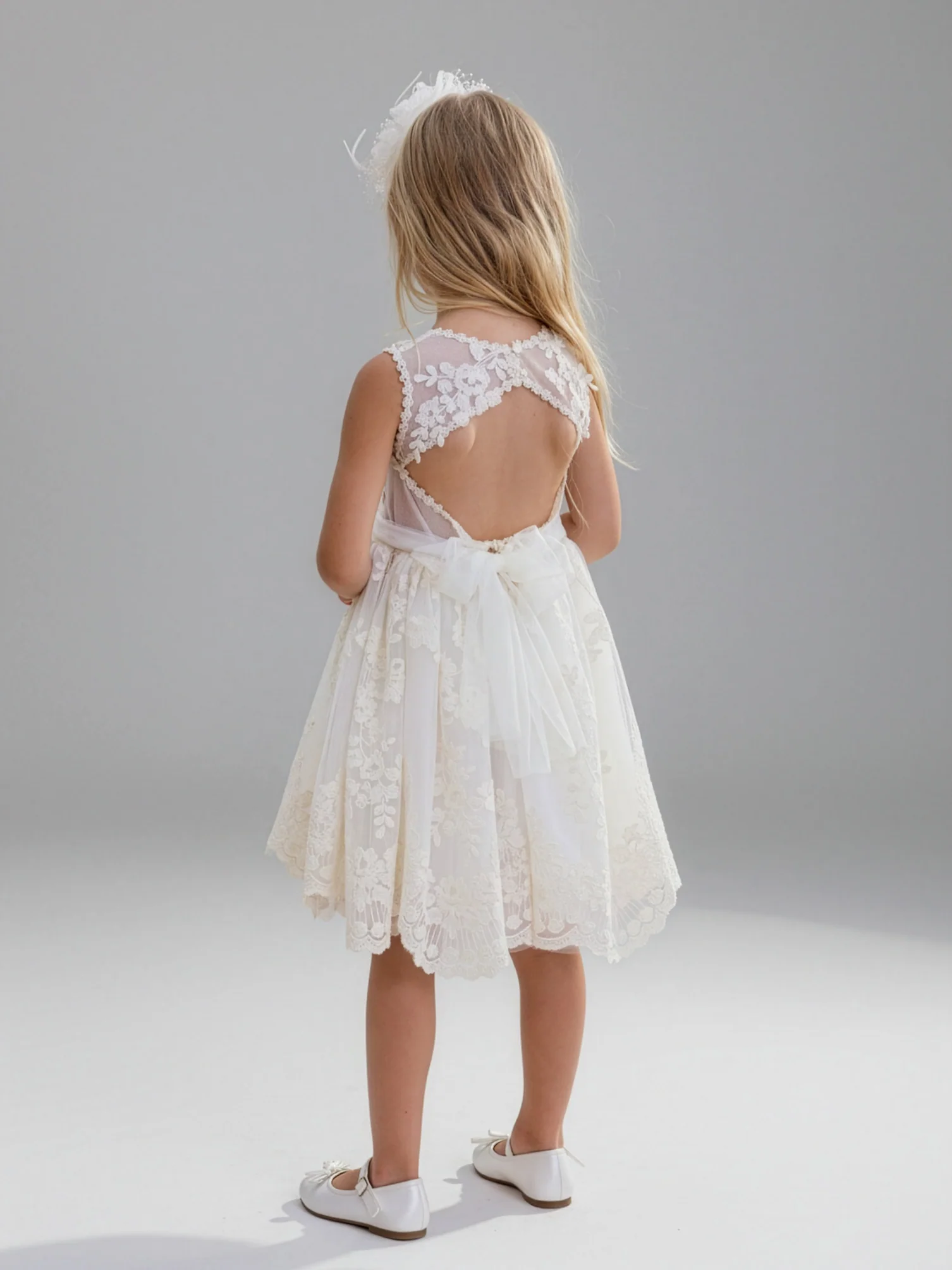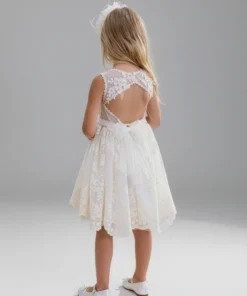 Designer’s Cat – Ρομαντικό φόρεμα με ανοικτή πλάτη, αμάνικο από φίνα γαλλική δαντέλα σε απαλό τούλι. Στρογγυλή λαιμό κόψη, φούστα με βολάν και εσωτερική επένδυση 100% βαμβάκι. Ένα όμορφο φόρεμα για ειδικές περιστάσεις.