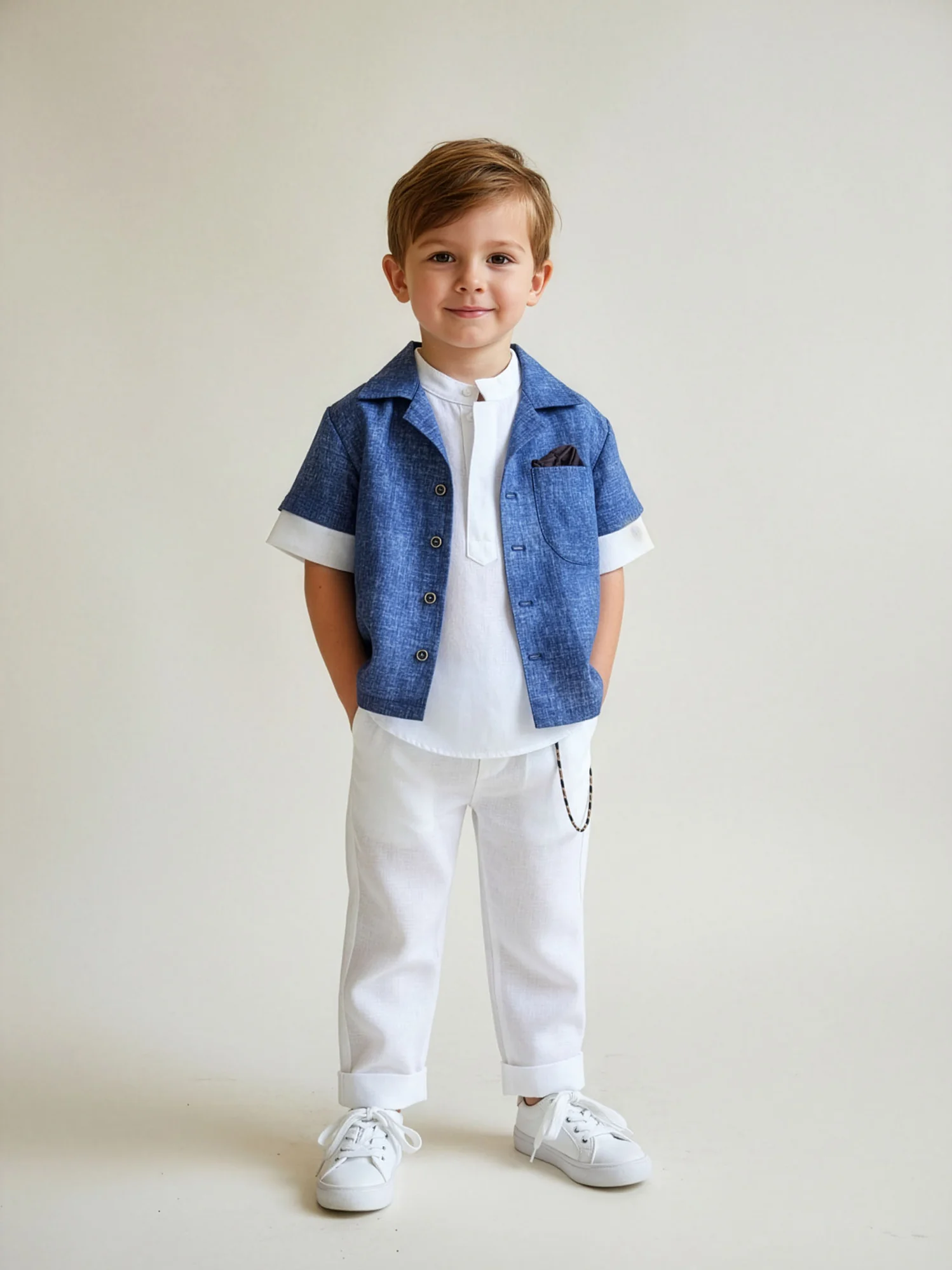 Μοντέρνο σετ βάπτισης 6 τεμαχίων για αγοράκι. Ένα άνετο σύνολο σε oversize γραμμή. Το σύνολο αποτελείται από ελαφρύ λινό σακάκι με κοντό μανίκι σε μπλε χρώμα. Ένα μοντέρνο πουκάμισο σε ίσια γραμμή με γιακά “Mao” και ασορτί παντελόνι από εξαιρετικό απαλό λινό ύφασμα σε λευκό χρώμα. Συνδυάζεται με αλυσίδα-αξεσουάρ, διακοσμητικό μαντήλι και καπέλο.