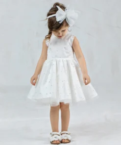 Designer’s Cat – Ρομαντικό εξώπλατο φόρεμα από μείγμα μεταξιού, αμάνικο με στρογγυλή λαιμό κόψη, διακοσμημένο με πέρλες σε τούλι. Υπέροχο πλισέ μάξι φιόγκο στο πίσω μέρος και φούστα με βολάν. Η εσωτερική επένδυση είναι 100% βαμβάκι. Εξαιρετική επιλογή για την ημέρα της βάπτισης αλλά και για ειδικές εκδηλώσεις.