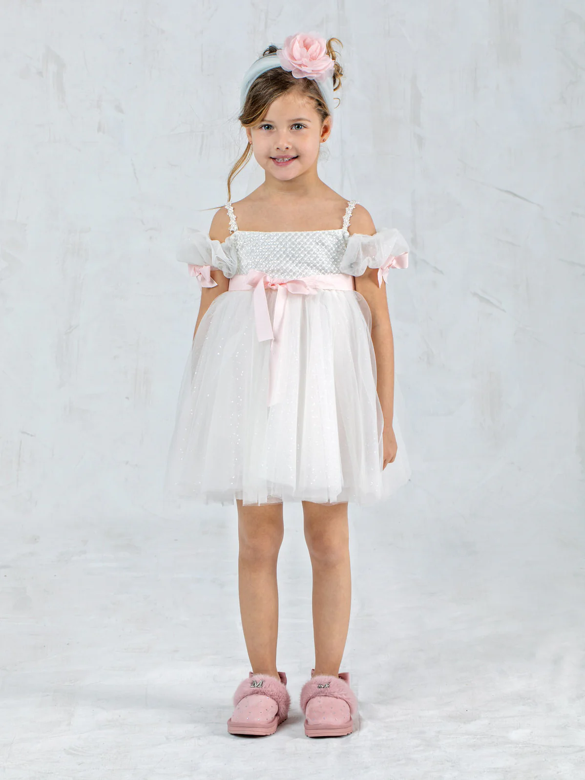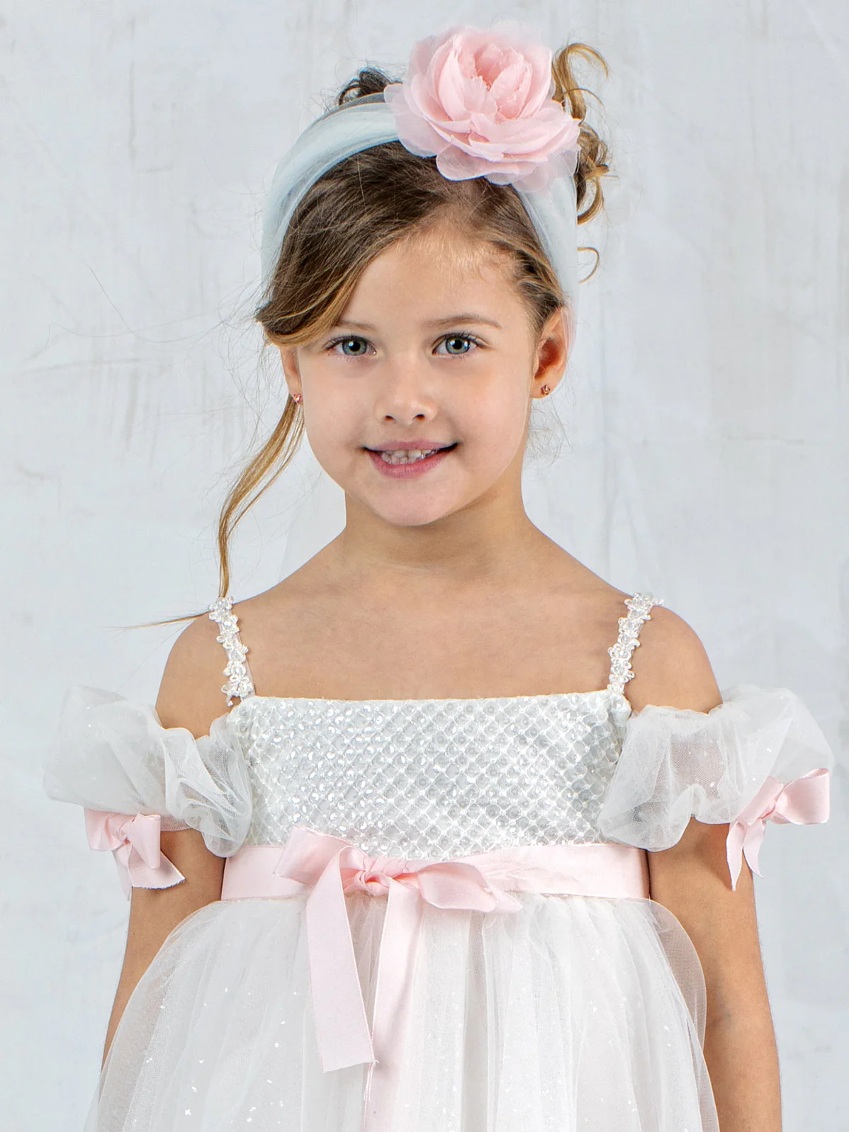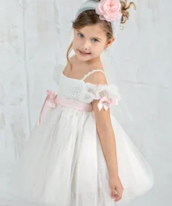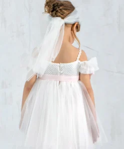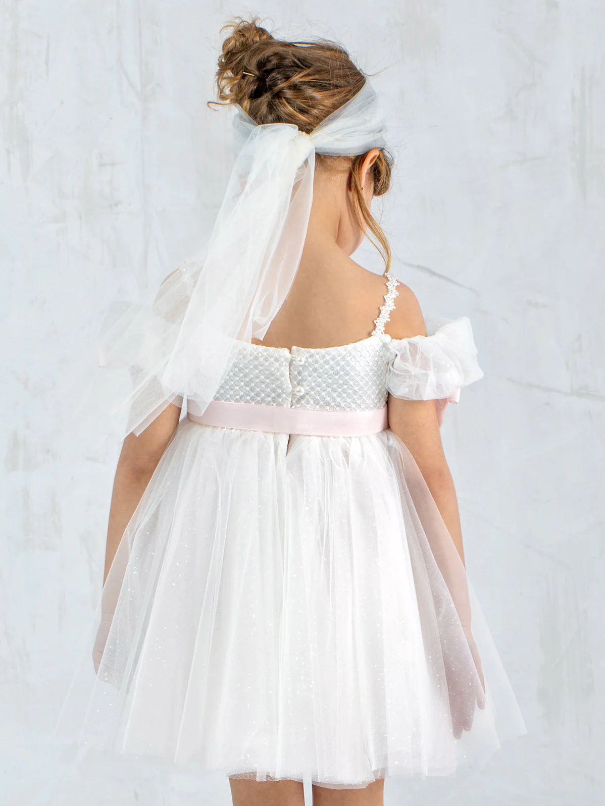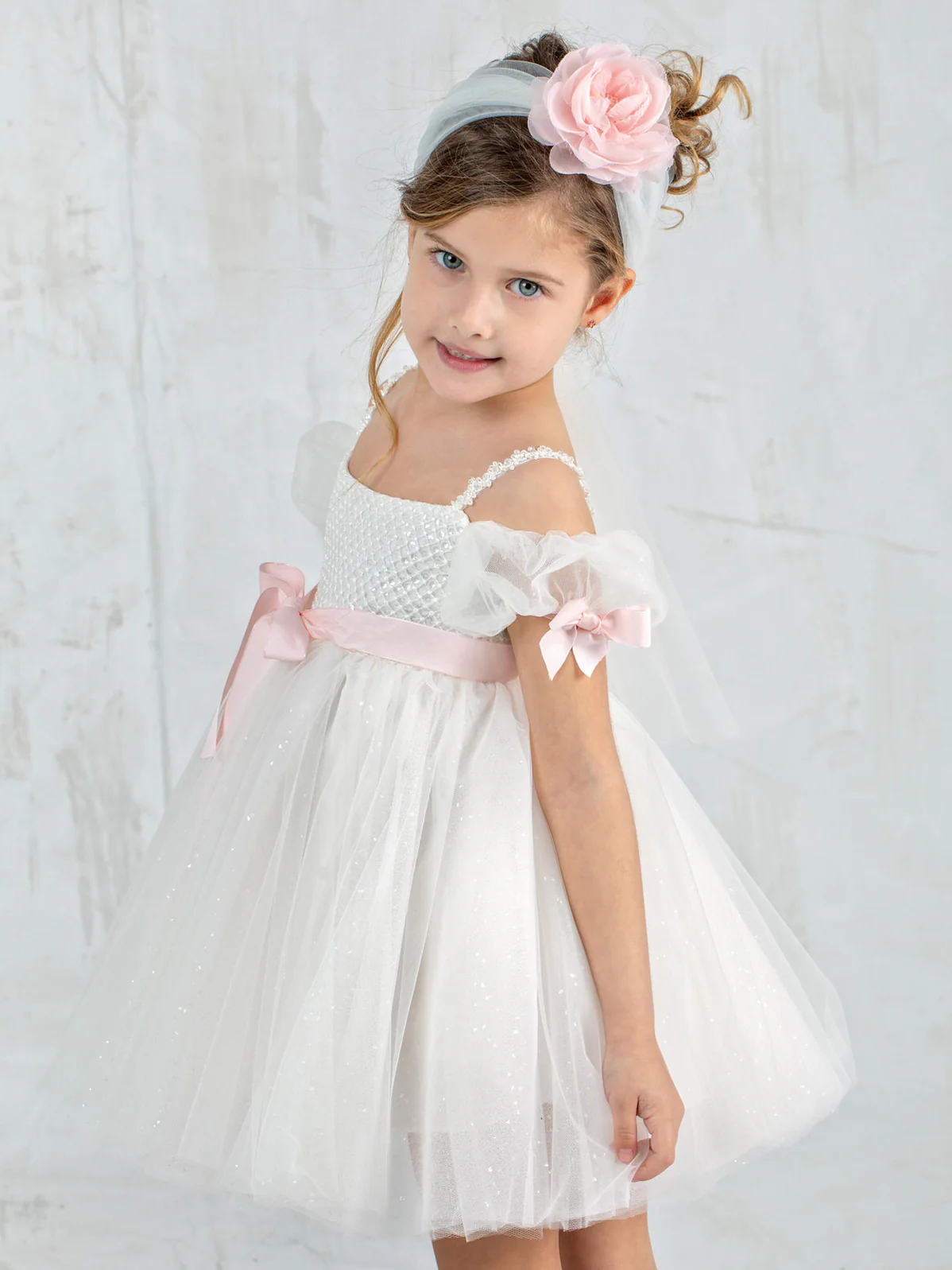 Designer’s Cat – off shoulder φόρεμα, με υπέροχο κεντημένο τούλι στο στήθος, διακοσμημένο με παγιέτες και σατέν ζώνη σε ροζ blush χρώμα. Η εσωτερική φόδρα είναι 100% βαμβάκι. Μια τέλεια επιλογή για όμορφες και αξέχαστες στιγμές. Συνδυάζεται με ασορτί αξεσουάρ μαλλιών.