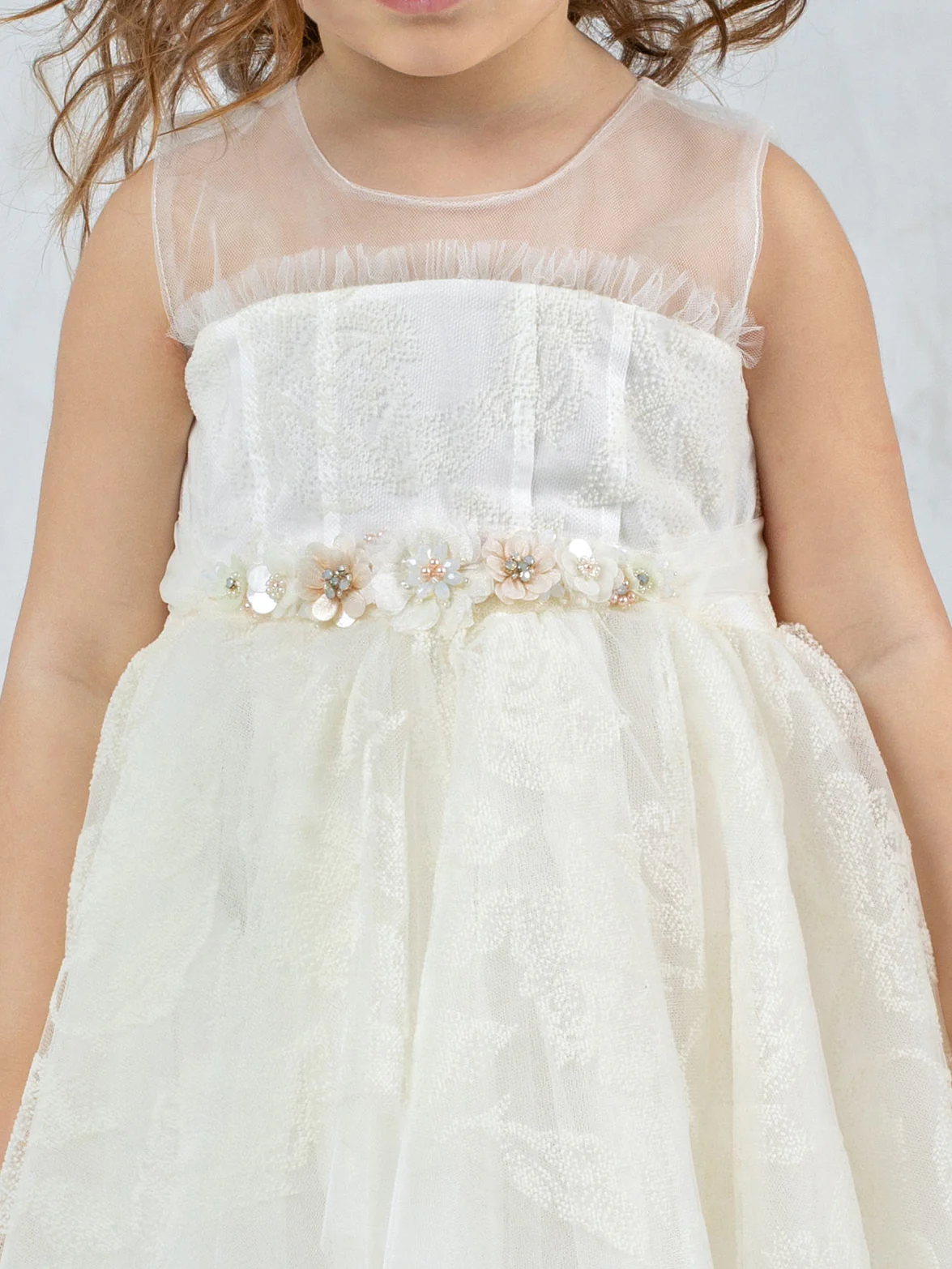 Designer’s Cat – Ρομαντικό αμάνικο φόρεμα, με ζακάρ μοτίβα στο τούλι και βολάν στο στήθος, διακοσμημένο με υπέροχη χειροποίητη ζώνη διακοσμημένη με πέτρες και κρύσταλα. Στρογγυλή λαιμόκοψη, φούστα με βολάν και εσωτερική φόδρα 100% βαμβάκι. Ένα φόρεμα εξαιρετικής αισθητικής που προσδίδει ρομαντισμό.
