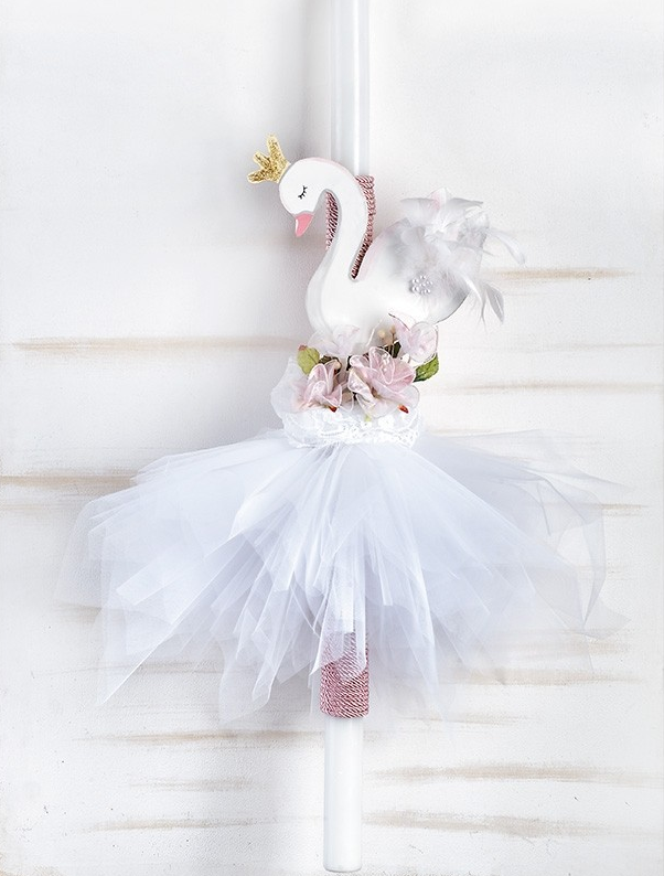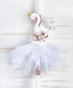 Λαμπάδα βάπτισης,ντυμένη με κορδόνι ροζ και διακοσμημένη με τούλι φουντωτό λευκό πάνω στο οποίο φαίνεται να στέκεται ένας κύκνος λευκός και κάτω από τον οποίο σχηματίζεται με δαντέλα ένα νούφαρο.Όλα σε αποχρώσεις λευκές-ροζ.