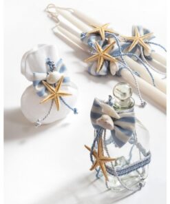 Σετ λαδιού σε λευκές-σιέλ αποχρώσεις, στολισμένα με κορδόνια λευκά-σιέλ,αστερίες και ριγέ σιέλ φιογκάκια.