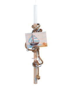 Λαμπάδα βάπτισης σε ναυτικό στυλ ντυμένη με λινό ύφασμα μπεζ και διακοσμημένη με ξύλινο καδράκι με ναυτική παράσταση σε αποχρώσεις μπεζ-σιέλ και καφέ.Η λαμπάδα διακοσμείται επιπλέον με χοντρό λινατσένιο καφέ σχοινί, πιο ψηλό σχοινί σε σιέλ χρώμα , αστερίες και κοχύλια.