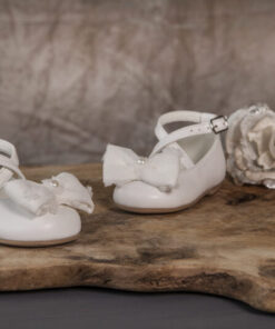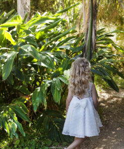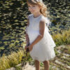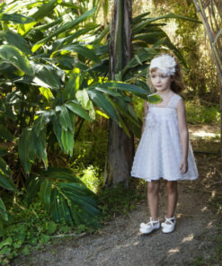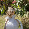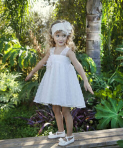 Ένα εντυπωσιακό φόρεμα βάπτισης Baby Bloom από ιδιαίτερο αραχνοΰφαντο ύφασμα με μανίκι από μια ιδιαίτερη ανάγλυφη δανδέλα και χειροποίητο λουλούδι το οποίο στολίζει την μέση του φορέματος , στο πίσω μέρος του  μια φανταστική πλάτη με Χ δέσιμο και μεγάλο φιόγκο στο τελείωμα.