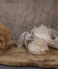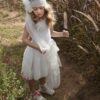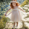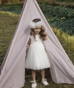 Εντυπωσιακό φόρεμα Baby Bloom ,υψηλής ραπτικής χαρακτηρίζει η εξαιρετικής ποιότητάς ανάγλυφη δανδέλα στο πίσω μέρος του φορέματος που σχηματίζει V με διαφάνεια τούλι κεντητό πουά. Το κορσάζ αποτελείται απο κεντητό πουά τούλι με εσωτερική επένδυση από μαλακό βαμβακερό ύφασμα . Τη μέση του φορέματος στολίζουν χειροποίητα λουλούδια απο τα οποία ξεκινάει ενα πέπλο απο κεντητό πουά τούλι που καταλήγει πιο μακρύ στο πίσω μέρος και αφαιρείται εύκολα . Ασορτί τούλινη κορδέλα με το ίδιο λουλούδι του φορέματος και κατ’ επιλογή μπαντάνα ή τουρμπάνι .