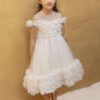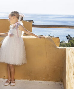 Φόρεμα βάπτισης Baby Βloom της συλλογής stile di vita mediterraneo 2024 από κεντητό πουά με εσωτερική επένδυση τούλια και μαλακό βαμβακερό ύφασμα. Το κορσάζ στολίζει κορδονέ βαμβακερή δαντέλα που συνεχίζει στην πλάτη με ένα εκθαμβωτικό φιόγκο από το ίδιο τούλι του φορέματος. Στην μέση του φορέματος υπάρχει βαμβακερή δαντέλα και μια σύνθεση από χειροποίητα λουλούδια.