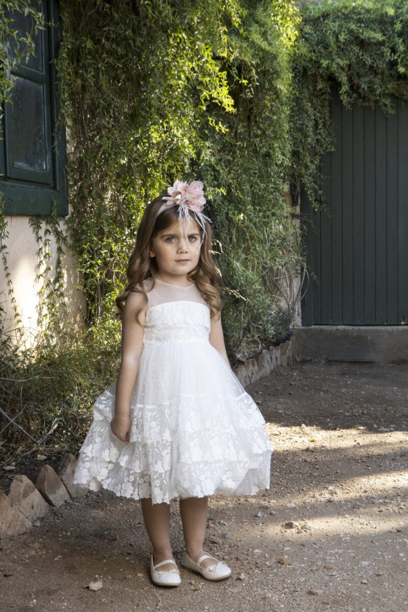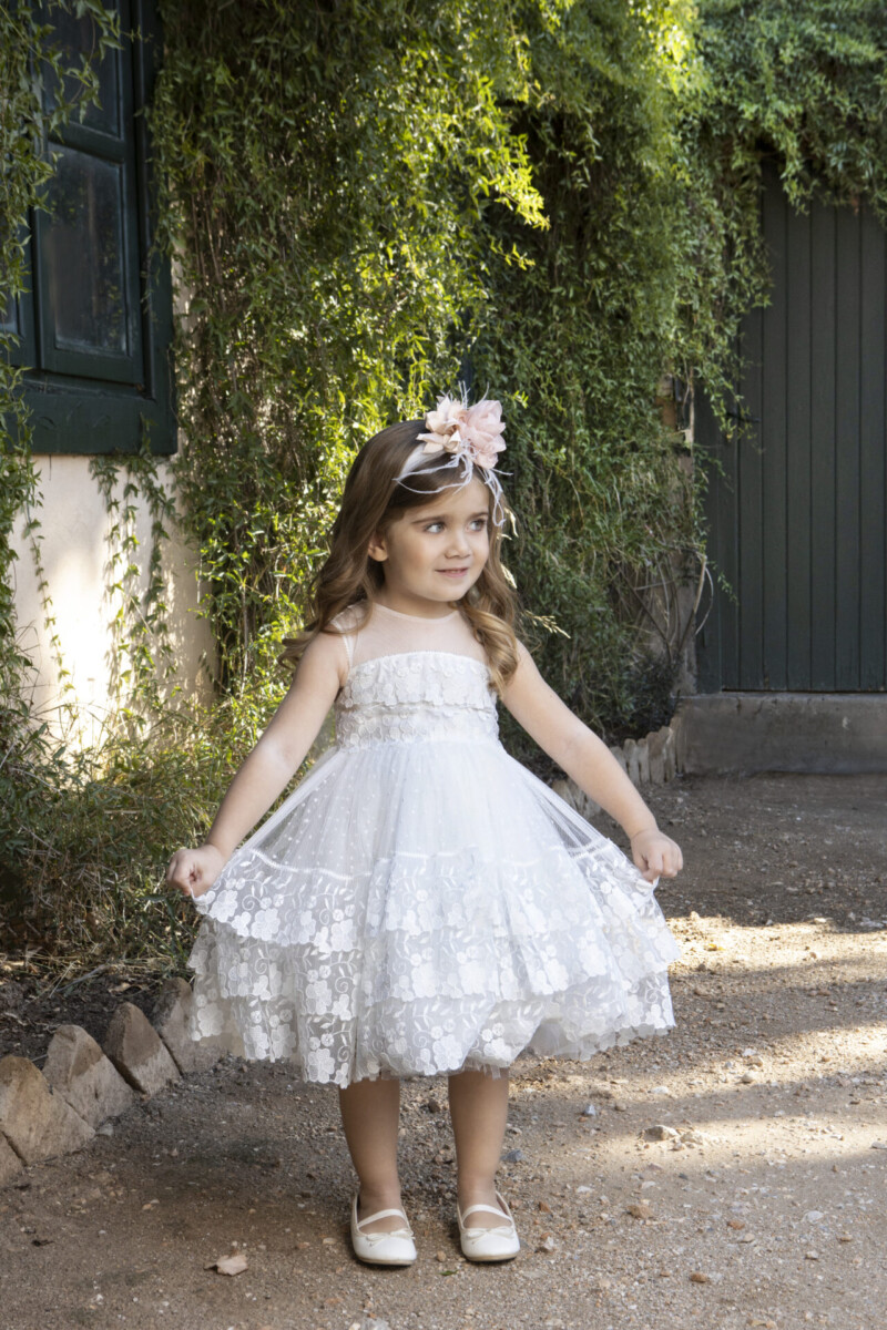 Φόρεμα βάπτισης Baby Βloom της συλλογής stile di vita mediterraneo 2024 που το χαρακτηρίζει η ιδιαίτερη ανάγλυφη δαντέλα στο κορσάζ που καταλήγει στην πλάτη με διαφάνεια. Πλουσια τούλινη φούστα με βολάν από την ίδια δαντέλα και εσωτερικά κεντητό τούλι πουά και μαλακό βαμβακερό ύφασμα δίνουν αέρινη κίνηση στο φόρεμα.