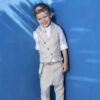 Ένα total white σέτ βάπτισης Baby Bloom της συλλογής stile di vita mediterraneo 2024 που αποτελείται από λευκή ανάγλυφη καπαρντίνα με μπεζ λεπτομέρειες,γιλέκο με λοξό κούμπωμα ,λευκό βαμβακερό πουκάμισο και παντελόνι λευκό με ιδιαίτερες τσέπες. Στο σετ περιλαμβάνονται επίσης ζώνη,υφασμάτινο παπιγιόν και ψάθινο καπέλο ή μπερές.