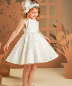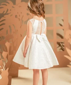 Ένα άκρως αριστοκρατικό φόρεμα σε off white χρώμα από κεντημένο τούλι κορδονέ με παγιέτες, ντουμπλαρισμένο με σατέν ντουσέζ. Το υπέροχο μπούστο παίζει με τις διαφάνειες και τα κοψίματα, προσθέτοντας ιδιαίτερο στυλ στο ρούχο, ενώ η πλούσια φούστα-ομπρέλα χαρίζει όγκο και κίνηση. Η σατέν ζώνη στη μέση καταλήγει σε σατέν διπλό φιόγκο στο πίσω μέρος και, μαζί με την κορδέλα για τα μαλλιά σε στυλ κουάφ, ολοκληρώνουν αρμονικά το μοναδικό αυτό φόρεμα.