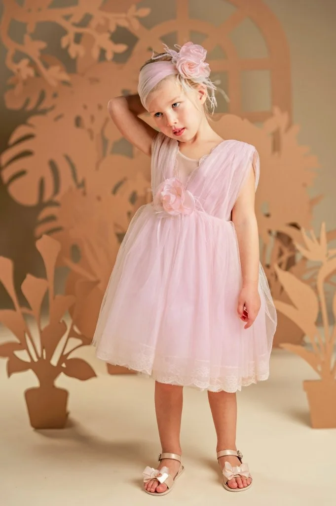 Ένα υπέροχο και αέρινο φόρεμα, φτιαγμένο από μαλακό τούλι σε απαλή απόχρωση του κυκλάμινου. Το μπούστο με πλούσιο ντραπέ στολίζεται κομψά με γαλλική δαντέλα, ενώ η φούστα με τις πολλαπλές στρώσεις από τούλι διακοσμείται με ένα χειροποίητο λουλούδι στο στήθος και ένα διακριτικό φιόγκο από δαντέλα στο πίσω μέρος. Η τούλινη κορδέλα για τα μαλλιά, διακοσμημένη επίσης με ένα μεγάλο λουλούδι και φτερά, ολοκληρώνει μοναδικά το ρομαντικό αυτό look.