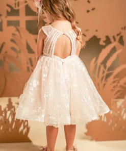 Ένα πανέμορφο ρομαντικό φόρεμα από κεντημένο πουά τούλι σε απαλή απόχρωση πούδρας. Το μπούστο έχει πλισσαριστό ντραπέ, διαφάνεια και εντυπωσιακή διάφανη πλάτη, διακοσμημένη με λεπτές στρώσεις δαντέλας. Η πλούσια κυματιστή φούστα-ομπρέλα, φτιαγμένη από το ίδιο ύφασμα, στολίζεται υπέροχα με χρωματιστά χειροποίητα λουλούδια, ίδια με αυτά που στολίζουν την τούλινη κορδέλα για τα μαλλιά.