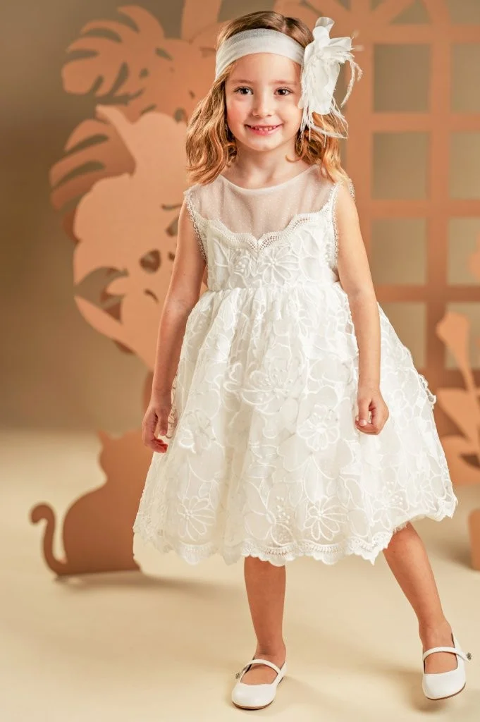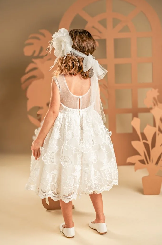 Ένα λουλουδάτο φόρεμα με έντονα ρομαντική διάθεση, φτιαγμένο από ένα μοναδικό κεντημένο ύφασμα με απλικέ λουλούδια σε off white απόχρωση. Το μπούστο παίζει με τις διαφάνειες στο στήθος και την πλάτη, χάρη στο πουά τούλι, ενώ η πλούσια κεντημένη φούστα ξεχωρίζει από μόνη της για την εντυπωσιακή της εμφάνιση. Η τούλινη κορδέλα για τα μαλλιά, στολισμένη με ένα μεγάλο χειροποίητο λουλούδι, ολοκληρώνει όμορφα το look.
