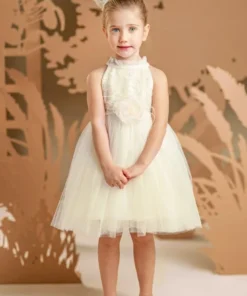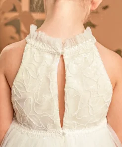 Ένα παραμυθένιο φόρεμα στο απαλό χρώμα της βανίλιας με ιδιαίτερο μπούστο και παρτούς ώμους, φτιαγμένο από κέντημένο τούλι κορδονέ με παγιέτες και βολάν στη λαιμόκοψη. Η τούλινη φούστα με τα πολλά layers χαρίζει αέρινη εικόνα, ενώ το χειροποίητο λουλούδι στο στήθος τονίζει τη μοναδικότητα του φορέματος. Το σύνολο ολοκληρώνεται με μια τούλινη κορδέλα για τα μαλλιά, διακοσμημένη με ένα μεγάλο χειροποίητο λουλούδι ασορτί με αυτό του φορέματος.