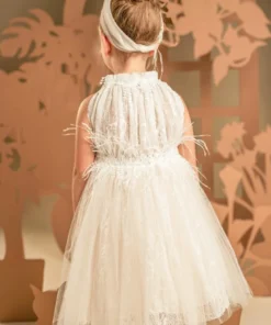 Ένα υπέροχο ρομαντικό φόρεμα σε απαλή απόχρωση της πούδρας, φτιαγμένο από ραφινάτη γαλλική δαντέλα και μαλακό τούλι. Το ντραπαριστό και πλούσιο μπούστο, με σούρες στη λαιμόκοψη αναδεικνύει τη μοναδικότητα του σχεδίου, ενώ οι αποκαλυπτικοί ώμοι προσδίδουν μια αίσθηση κομψότητας. Η φούστα με πλούσιες σούρες, στολίζεται υπέροχα στη μέση με μια διακοσμητική, απλικέ φλοράλ τρέσα και φτερά στρουθοκαμήλου. Το σύνολο ολοκληρώνεται με κορδέλα για τα μαλλιά, διακοσμημένη με φιόγκο, φτερά και λουλούδια.