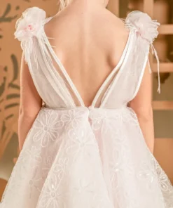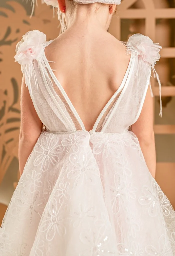 Ένα μαγευτικό φόρεμα με μοναδικό σχέδιο σε απαλή απόχρωση του κυκλάμινου , φτιαγμένο από κεντημένη δαντέλα με μαργαρίτες. Το μπούστο παίζει με τις στρώσεις και τις διαφάνειες, ενώ στους ώμους στολίζεται με χειροποίητα λουλούδια και φτερά. Η φούστα-ομπρέλα, με πολλές στρώσεις και διαφορετικά μήκη, χαρίζει όγκο και κίνηση. Το σύνολο ολοκληρώνει η τούλινη κορδέλα για τα μαλλιά, διακοσμημένη υπέροχα με φιόγκο, λουλούδι και φτερά.