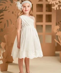 Ένα πανέμορφο φόρεμα εμπνευσμένο από την αρχαία Ελλάδα, φτιαγμένο από κεντημένη μουσελίνα σε off white απόχρωση. Το μπούστο είναι ντραπαριστό μπροστά στον ένα ώμο, προσδίδοντας αέρινη κομψότητα και απλότητα, ενώ η πλούσια φούστα με τη σούρα καταλήγει σε περίτεχνο κέντημα στο τελείωμα. Η στριφτή ζώνη στη μέση, μαζί με την τούλινη κορδέλα για τα μαλλιά στολισμένη με μεγάλο χειροποίητο λουλούδι, ολοκληρώνουν αρμονικά το σύνολο.