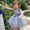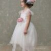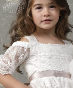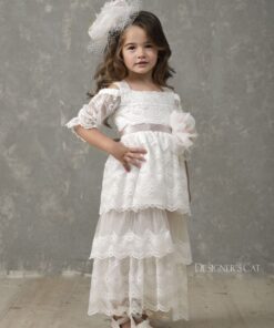 Κομψό μακρύ φόρεμα από όμορφη γαλλική δαντέλα και τρέσες, με υπέροχα μανίκια που αγκαλιάζουν απαλά τους ώμους. Η εντυπωσιακή φούστα με τα  3 βολάν  είναι, διακοσμημένη με όμορφα χειροποίητα ροζ λουλούδια και ασορτί σατέν ζώνη. Το ivory χρώμα δίνει μια αίσθηση απλότητας αλλά και πολυτέλειας. Ένα ιδανικό φόρεμα για ειδικές περιπτώσεις…