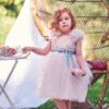 Ρομαντικό vintage φόρεμα με μανίκι από ειδικό τούλι κεντήματος με τελείες, διακοσμημένο με υπέροχη κορδέλα Grosgrain στη μέση. Έχει μαλακή μεικτή επένδυση για άνεση (70% βαμβάκι-30% μετάξι). Το φόρεμα της Catalina μπορεί να συνδυαστεί με ταιριαστά αξεσουάρ μαλλιών και παπούτσια από τη συλλογή “Designer’s Cat Shoes”. Μέγεθος: 1 – 12 ετών. Χρώμα: ροζ.