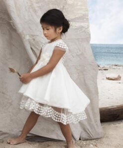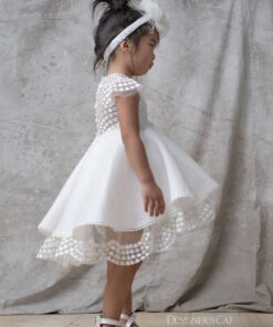 Υπέροχο φόρεμα από εξαιρετικό σύμμικτο ύφασμα (μετάξι και λινό), διακοσμημένο με κεντημένο τούλι από υπέροχα μικρά μοτίβα (καρδιές) και χειροποίητο λουλούδι.Το off white χρώμα δίνει μια αριστοκρατική αίσθηση. Εσωτερικά είναι επενδυμένο με ύφασμα 100% βαμβάκι. Ένα μοναδικό σύνολο για αέρινες και εντυπωσιακές εμφανίσεις. Συνδυάζεται άψογα με αντίστοιχο μπολερό και παπούτσια.