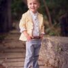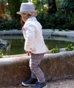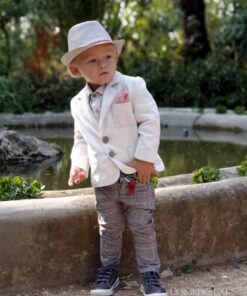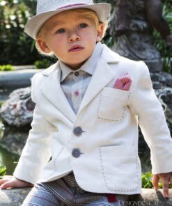 Εντυπωσιακό σύνολο από εξαιρετικής ποιότητας υφάσματα (λινό και βαμβάκι), διακοσμημένο με υπέροχα κουμπιά και μοναδικές λεπτομέρειες.To σακάκι και το πουκάμισο είναι 100% λινό, που συνδυάζονται με το όμορφο μοντέρνο παντελόνι από 100% βαμβακερό Jacquard. Το σετ αποτελείται από 6 τεμ. (σακάκι,παντελόνι, πουκάμισο, καπέλο, μαντηλάκι και ασορτί ζώνη). Ένας υπέροχος συνδυασμός χρωμάτων και αξεσουάρ που δεν θα περάσει απαρατήρητος. Μπορεί να συνδυαστεί άψογα με παπούτσια της συλλογής “Designer’s Cat shoes”. Διαθέσιμα μεγέθη: από 1 έως 12 ετών. Σημείωση: Το καπέλο περιλαμβάνεται στο σετ μόνο για τα μεγέθη 1-3 ετών (σετ 6 τεμ). Για τα μεγέθη 4-12 ετών δεν συμπεριλαμβάνεται στο σετ το καπέλο (σετ 5 τεμ.)