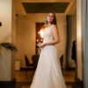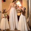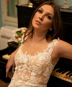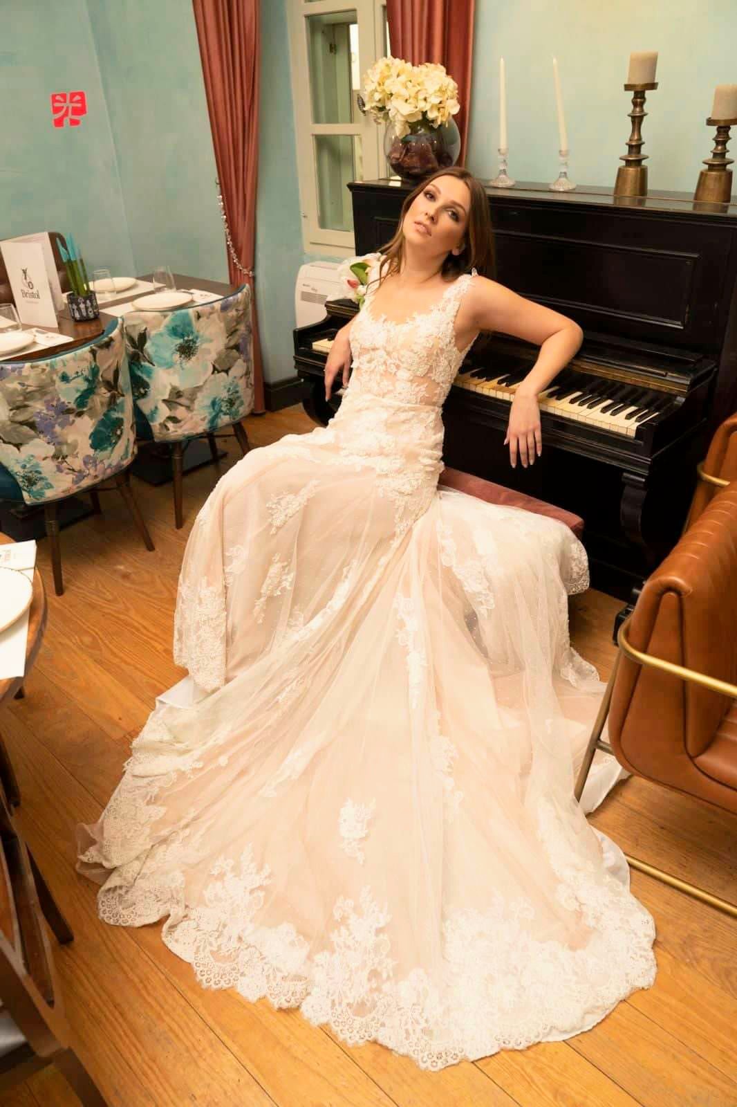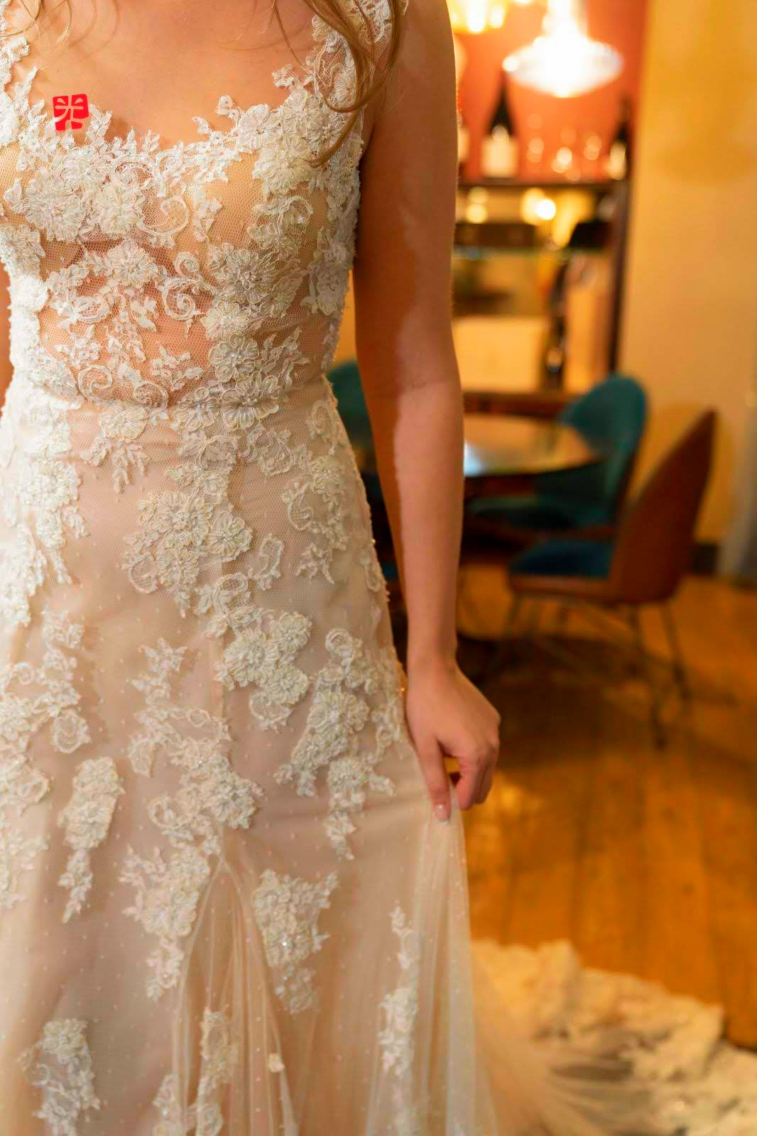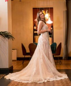 Λαμπερό νυφικό από γαλλική δαντέλα με φόντο nude μεταξωτό και πουά, σε Α γραμμή με ουρά να του χαρίζει φινέτσα.