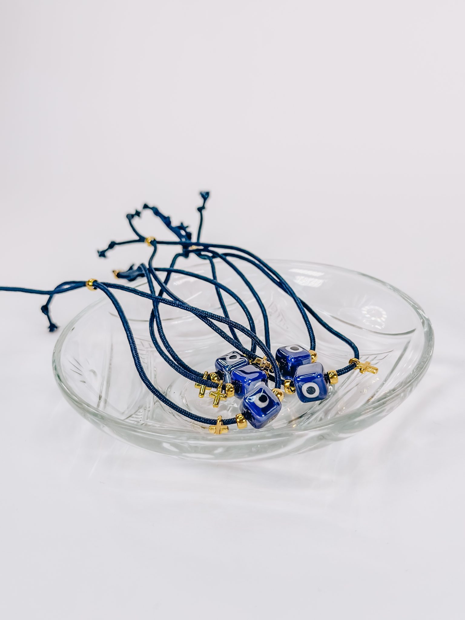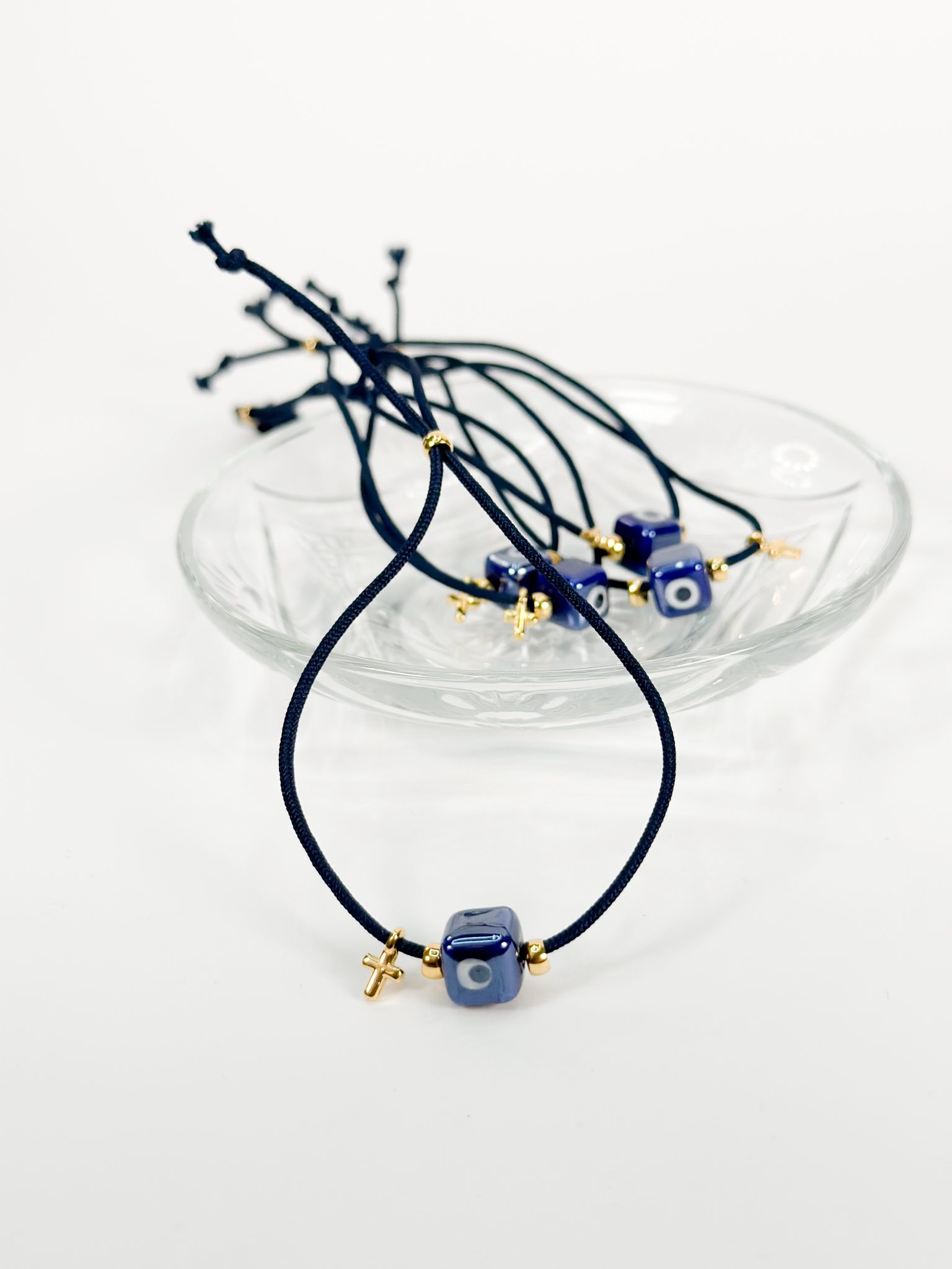 Μαρτυρικό βραχιόλι με μπλε κορδόνι,χρυσό επιχρυσωμένο σταυρό και κεραμικός κύβος μπλε με μάτι.