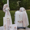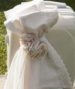 Κ21.05 τρόλεϊ με πλούσιο στολισμό σε εκρού – σομόν απόχρωση με ιδιαίτερη ανάγλυφη δανδελα, πλούσια τούλια και χειροποίητα λουλούδια, ασορτί λαμπάδα με τον ίδιο στολισμό , σετ λαδιού (3 κεράκια, μπουκαλάκι λαδιού, σαπουνάκι) και το ευχολόγιο. Κάθε πακέτο βάπτισης μπορεί να στολιστεί με οποιοδήποτε φόρεμα της συλλογής Ariadne’s thread.