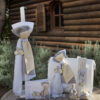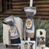 Πακέτο βάπτισης Baby Bloom καλάθι ψάθα , λαμπάδα  , σετ λαδιού ( 3 κεράκια , μπουκαλάκι λαδιού και σαπουνάκι ) και το ευχολόγιο , στολισμένα όλα με τα υφάσματα του ρούχου .