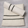 Βαμβακερά  λαδόπανα σε ιβουάρ χρώμα με ιμάντα μπλέ στο τελειωμά του και ιδιαίτερο δέσιμο. Τα λαδόπανα περιλαμβάνουν μεγάλη πετσέτα και σεντόνι , πετσέτα μικρη και εσώρουχα.