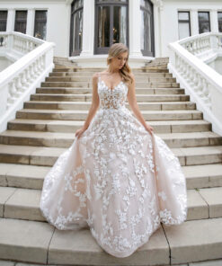 Κομψό νυφικό σε A-line από την collection Εnzoani με πανέμορφα μοτίβα λουλουδιών.Η χαμηλή λαιμόκοψη και η εντυπωσιακή πλάτη σε συνδυασμό με τη τη μαγευτική δαντέλα της Marie συμπληρώνουν ένα όμορφο νυφικό που κλέβει τις εντυπώσεις…