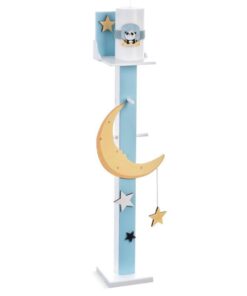 Ξύλινος λευκός κηροστάτης-κρεμάστρα,ζωγραφισμένος στο χέρι σε αποχρώσεις σιέλ-κίτρινες.Μπροστά είναι διακοσμημένος με ξύλινα αστεράκια και ξύλινο μεγάλο κίτρινο φεγγάρι από το οποίο κρέμεται ξύλινο κίτρινο αστεράκι,ενώ το πάνω μέρος του κηροστάτη διακοσμείται επίσης με ξύλινα αστεράκια.Στην τιμή περιλαμβάνεται και το κερί για την εκκλησία.