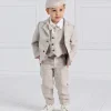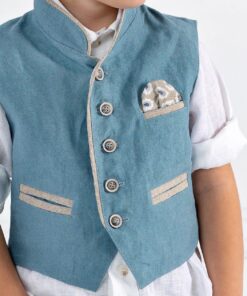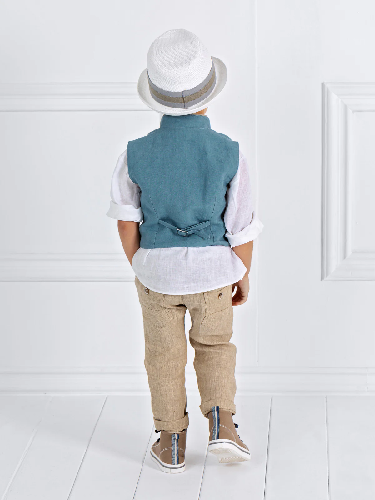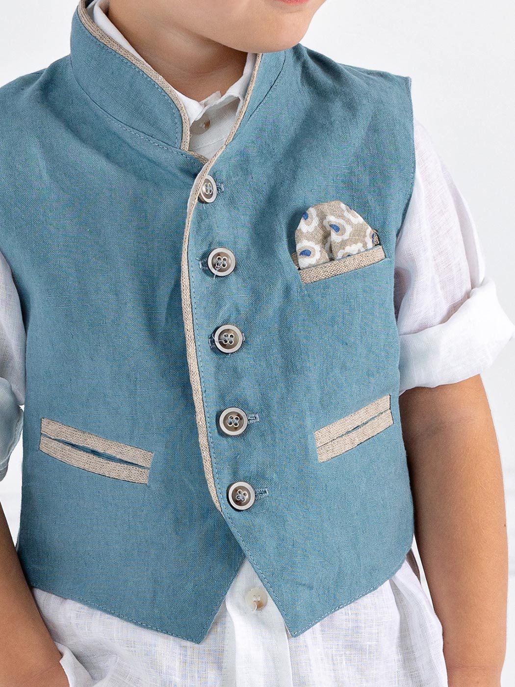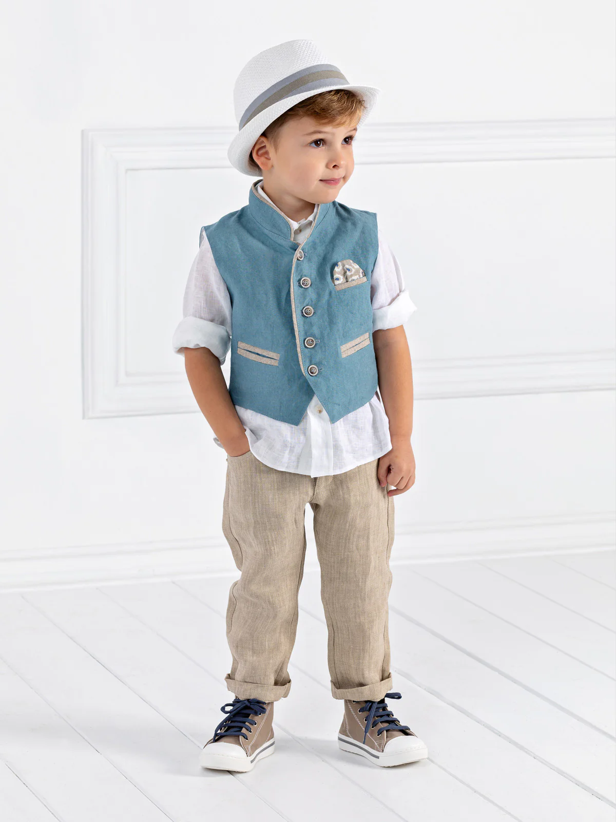 Μοντέρνο σύνολο βάπτισης που αποτελείται από λινό γιλέκο με χαμηλό γιακά, λινό μπεζ παντελόνι και λευκό πουκάμισο σε κανονική γραμμή. Το outfit ολοκληρώνεται με ασορτί καπέλο, ζώνη και διακοσμητικό μαντήλι. Μια τέλεια επιλογή για ειδικές περιστάσεις.