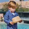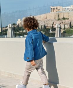 Κοστούμι με ολοκαίνουργιο σχέδιο Stova στο σακάκι, με λοξό κούμπωμα και όρθιο γιακά, αποτελούμενο από 6 τεμάχια σε αποχρώσεις που κυριαρχεί το μπλe και πούρο. Σιέλ βαμβακερό πουκάμισο με διακριτικό πυκνό πουά. Στο σετ περιλαμβάνονται ζώνη ιμάντας καθώς επίσης ξύλινο παπιγιόν και ψάθινο καπέλο.