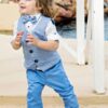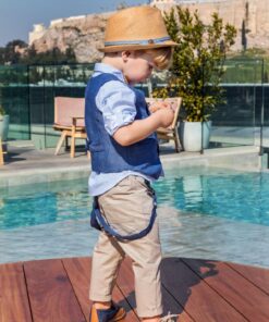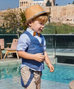 Ο πιο αγαπημένος συνδυασμός χρωμάτων σε ένα βαπτιστικό σετ, αποτελούμενο από 6 τεμάχια σε αποχρώσεις που κυριαρχεί το μπλε και το πούρο. Το πουκάμισο έχει λευκή βάση με πολύ πυκνό τύπωμα σιέλ που δίνει την αίσθηση του μονόχρωμου σιέλ, γιλέκο από σιέλ-μπλε ψάθα λινή και καπαρντίνα παντελόνι στην απόχρωση του πούρου. Στο σετ περιλαμβάνονται τιράντες, ξύλινο παπιγιόν και ψάθινο καπέλο.
