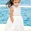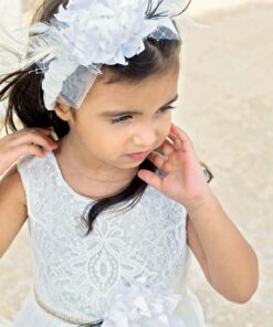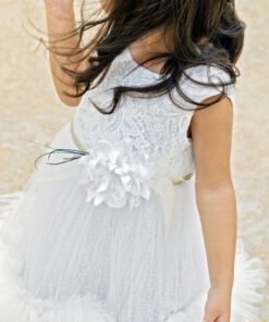 Ανάλαφρο αμάνικο φόρεμα με μπούστο από γαλλική δαντέλα κορδονέ, χρυσή ζώνη πλεξίδα & διακοσμητικό τούλι πουά με τελείωμα τούλινο βολάν . Εσωτερικά έχει επενδυθεί με βαμβακερή φόδρα. Ένα φόρεμα που ολοκληρώνεται με υπέροχο λευκό λουλούδι στόλισμα στη μέση με πούπουλο και φτερό σε απόχρωση πράσινου φύλλου. Διατίθεται με ασορτί κορδέλα για τα μαλλιά.