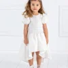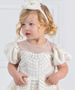 Εντυπωσιακό μεταξωτό φόρεμα βάπτισης από φίνο κεντημένο τούλι με υπέροχα μικρά μοτίβα(καρδούλες). Φουσκωτό μανίκι, στρογγυλή λαιμό κόψη και εσωτερική φόδρα 100% βαμβάκι. Το υπόλευκο χρώμα προσδίδει μια απλή αλλά ταυτόχρονα και αριστοκρατική πινελιά στο ντύσιμο.
