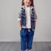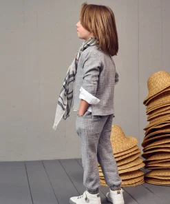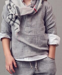 Σετ βάπτισης 5 τεμ. για αγόρι. Μοναδικό άνετο σύνολο σε μποέμ στυλ. Το τοπ και το παντελόνι είναι από εξαιρετικό απαλό βαμβακερό ζακάρ ύφασμα σε ανοιχτό γκρι χρώμα.Συνδυάζεται με βαμβακερό πουκάμισο σε στυλ «Mao» και υπέροχο καρό φουλάρι. Πολύ δυνατή και μοντέρνα επιλογή για την μοναδική στιγμή της βάπτισης.